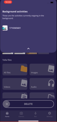 Tella now encrypts files in the background while you continue to use the app. This means you can take photos, videos, or import files without any interruptions. To keep you informed, we've added a Background Activity tray accessible from the Tella homescreen. Simply tap the notifications icon (🔔) on the top left to view ongoing activities: you can track the files in queue and monitor the encryption progress for your files.