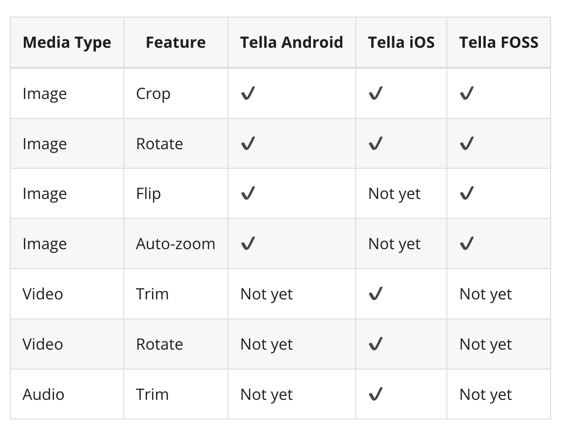 In our documentation you can see all the beautiful ✔️. If there’s a feature marked as “Not yet” that you need, we’d love to hear from you, so we can explore ways to include it in Tella’s roadmap. As you know, Tella's future is uncertain and fragile, so the possibility to sustain and justify feature development based on community needs is especially important right now.